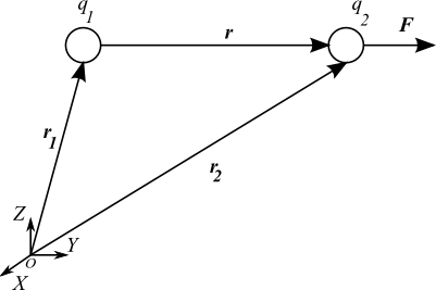 donde q1 y q2 son las cargas eléctricas que están interactuando, r la distancia que las separa, r = r/r el vector unitario que define la dirección de la fuerza electrostática y k = (1/4pi.e0), es la constante eléctrica que depende del medio donde se efectue la interacción, por ejemplo cuando las cargas eléctricas se encuentran en el vacio esta toma un valor de: 8.854 187 817... E-12 C^2/N m^2.